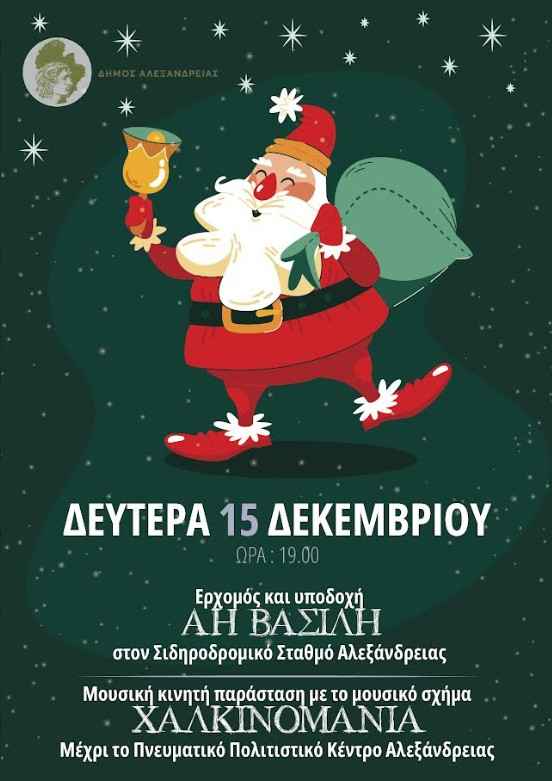 Ο Δήμος Αλεξάνδρειας ανακοινώνει με χαρά την άφιξη του Άη Βασίλη στον Σταθμό Αλεξάνδρειας, σκορπίζοντας γιορτινή μαγεία και χαμόγελα σε μικρούς και μεγάλους. Ο αγαπημένος Άγιος των παιδιών, θα φτάσει στον σταθμό, συνοδευόμενος από χριστουγεννιάτικη μουσική και εορταστική ατμόσφαιρα. Από εκεί θα ακολουθήσει μουσική πορεία με τη μπάντα “ΧΑΛΚΙΝΟΜΑΝΙΑ” προς το Πνευματικό Πολιτιστικό Κέντρο της πόλης, όπου θα συνεχιστεί η γιορτή με μοναδικές εκπλήξεις.