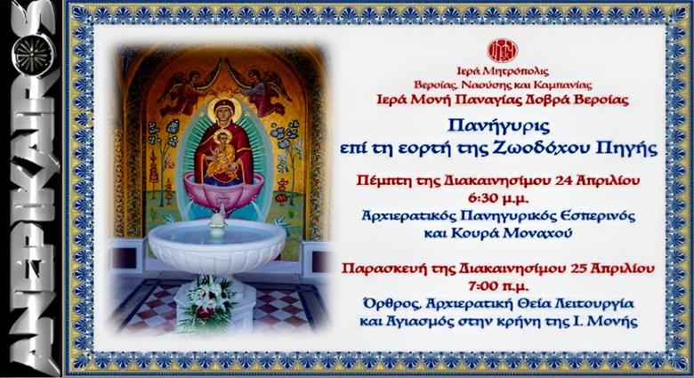 Την Παρασκευή της Διακαινησίμου εορτάζει και πανηγυρίζει η Ιερά Μονή Παναγίας Δοβρά Βεροίας, επί τη εορτή της Ζωοδόχου Πηγής, μιας από τις θεομητορικές εορτές της Υπεραγίας Θεοτόκου, η οποία αποτελεί και την κύρια πανήγυρη της Μονής.