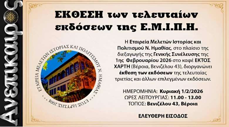 Η Εταιρεία Μελετών Ιστορίας και Πολιτισμού Ν. Ημαθίας (Ε.Μ.Ι.Π.Η.) πραγματοποιεί την Κυριακή 1 Φεβρουαρίου 2026 και ώρα 11.00 Εκλογοαπολογιστική Γενική Συνέλευση στο καφέ ΕΚΤΟΣ ΧΑΡΤΗ – Γκαλερί Παπατζίκου, επί της οδού Βενιζέλου 43, στην Βέροια.