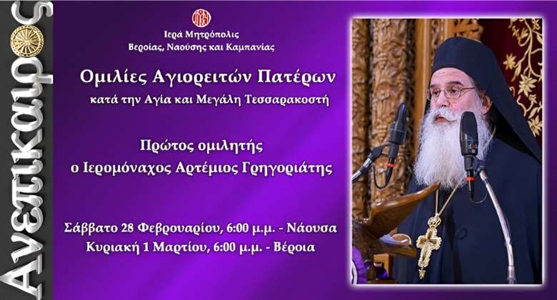 Με την πατρική μέριμνα του Ποιμενάρχου μας, Σεβασμιωτάτου Μητροπολίτου Βεροίας, Ναούσης και Καμπανίας κ. Παντελεήμονος θα πραγματοποιηθούν για ακόμη μία χρονιά οι ομιλίες των Αγιορειτών Πατέρων κατά τα Σαββατοκύριακα της Αγίας και Μεγάλης Τεσσαρακοστής.