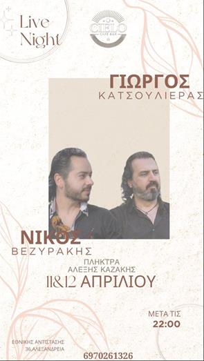 Την Παρασκευή 11 Απριλίου και το Σάββατο 12, το Cielo Cafe Bar μεταμορφώνεται σε ένα παραδοσιακό κρητικό χώρο, φιλοξενώντας δύο κορυφαίους καλλιτέχνες της κρητικής μουσικής σκηνής: τον Νίκο Βεζυράκη και τον Γιώργο Κατσουλιέρα.