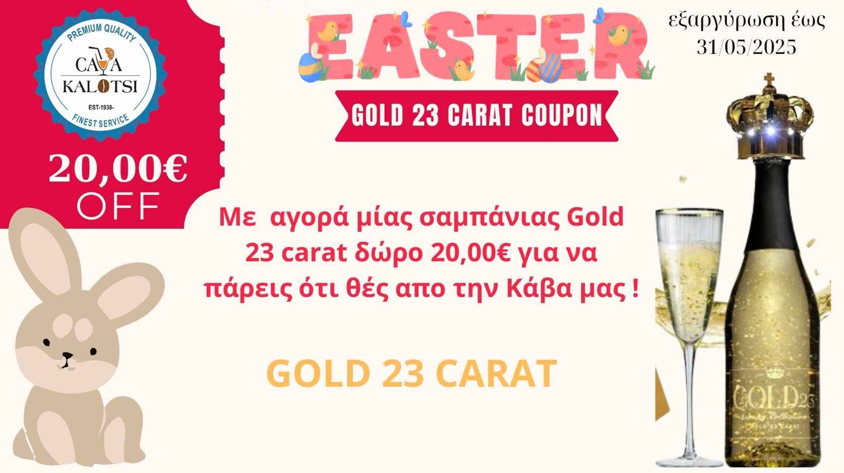Με την αγορά της σαμπάνιας Πάρε δώρο κουπόνι αξίας 20€ για τις αγορές σου για το πασχαλινό τραπέζι – μόνο από την Κάβα Καλότση!