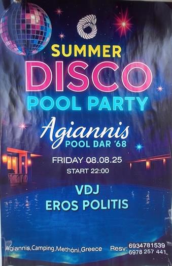 Ετοιμαστείτε για μια αξέχαστη βραδιά γεμάτη ρυθμό και λάμψη! Την Παρασκευή 8 Αυγούστου, το Pool Bar '68 στον χώρο του Camping Αγιάννης στη Μεθώνη Πιερίας, σας προσκαλεί στο πιο λαμπερό Summer Disco Pool Party!