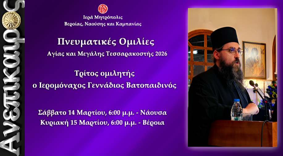 Με την πατρική μέριμνα του Ποιμενάρχου μας, Σεβασμιωτάτου Μητροπολίτου Βεροίας, Ναούσης και Καμπανίας κ. Παντελεήμονος πραγματοποιούνται για ακόμη μία χρονιά οι πνευματικές ομιλίες κατά τα Σαββατοκύριακα της Αγίας και Μεγάλης Τεσσαρακοστής.