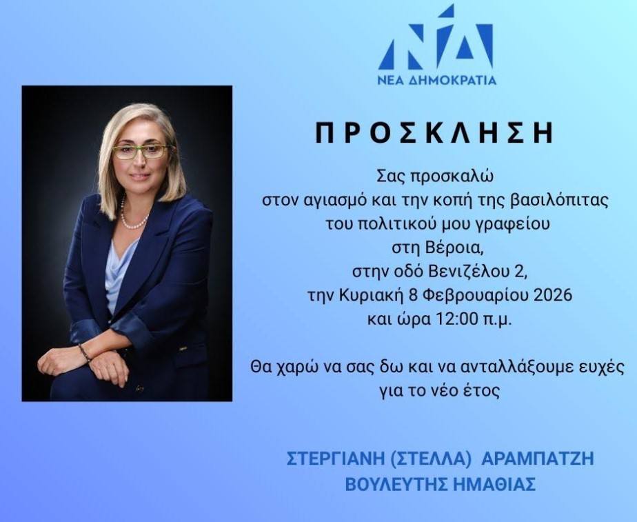 Πρόσκληση στον αγιασμό του πολιτικού γραφείου της Στέλλας Αραμπατζή στην Βέροια και κοπή βασιλόπιτας.