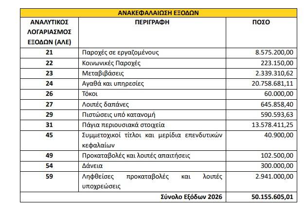 Το μεγαλύτερο μέρος των εξόδων αφορά αγαθά και υπηρεσίες, τα οποία ξεπερνούν τα 20,7 εκατομμύρια ευρώ, δείχνοντας ότι το λειτουργικό κόστος παραμένει ιδιαίτερα υψηλό.