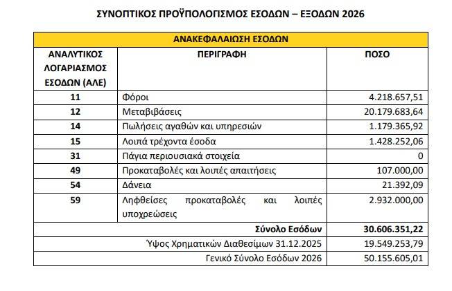 Το χρηματοδοτικό κενό των 19,55 εκατομμυρίων ευρώ καλύπτεται αποκλειστικά από τα χρηματικά διαθέσιμα της 31ης Δεκεμβρίου 2025. Η πρακτική αυτή επιτρέπει την τυπική ισοσκέλιση του προϋπολογισμού, αλλά δεν αναιρεί το γεγονός ότι πρόκειται για μια λύση που δεν μπορεί να επαναλαμβάνεται επ’ αόριστον χωρίς συνέπειες.