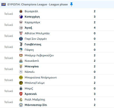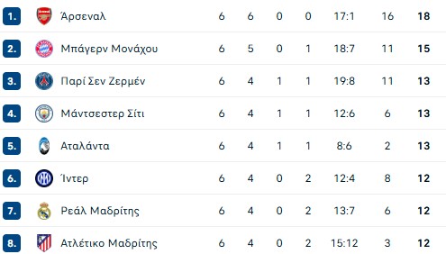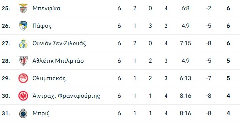 Στην 29η θέση της βαθμολογίας βρέθηκε ο Ολυμπιακός μετά την ολοκλήρωση της 6ης αγωνιστικής του Champions League, στην οποία έλαμψε η Μάντσεστερ Σίτι με τη νίκη της επί της Ρεάλ στη Μαδρίτη.