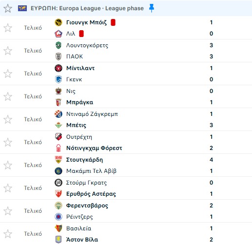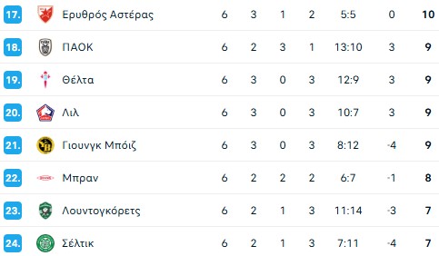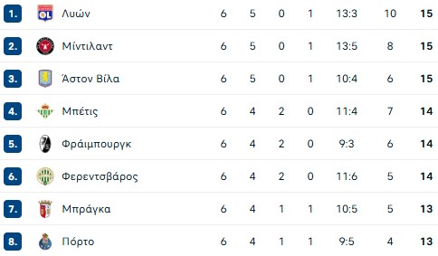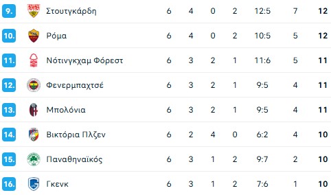 Δείτε πως διαμορφώθηκε η βαθμολογία της League Phase του Europa League μετά την ολοκλήρωση της 6ης αγωνιστικής και τις ισοπαλίες του Παναθηναϊκού και του ΠΑΟΚ