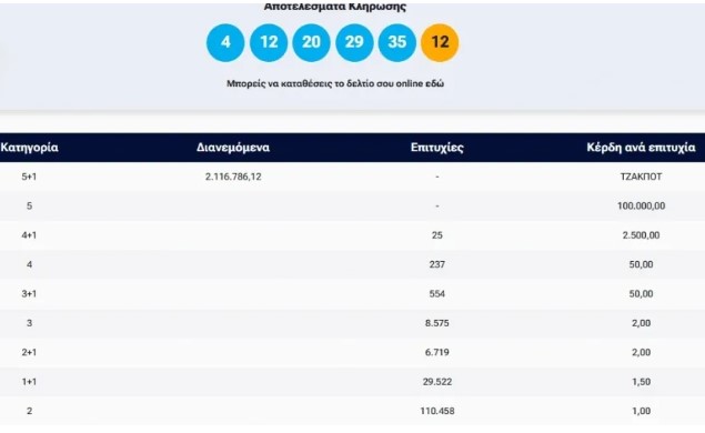 Οι τυχεροί αριθμοί που ανέδειξε η αποψινή κλήρωση είναι: 4, 12, 20, 29, 35 και Τζόκερ το 12.