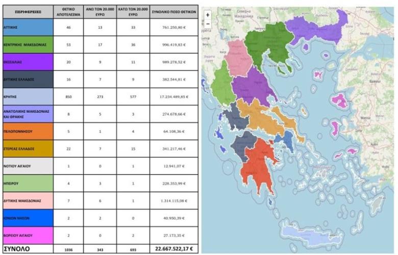 Ο χάρτης παρουσιάζει ανά περιφέρεια τον συνολικό αριθμό των ΑΦΜ που έλαβαν παράνομες επιδοτήσεις, την κατανομή τους ανάλογα με τα ποσά που εισέπραξαν, καθώς και το συνολικό ποσό που καταλογίστηκε.