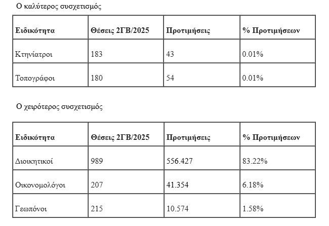 Στον πίνακα που ακολουθεί (προέκυψε με περαιτέρω επεξεργασία των στοιχείων ΑΣΕΠ) καταγράφονται οι ειδικότητες που εμφανίζουν τον χειρότερο και τον καλύτερο συσχετισμό ανάμεσα στις προτιμήσεις των αιτούντων και στις προσφερόμενες από την προκήρυξη θέσεις.
