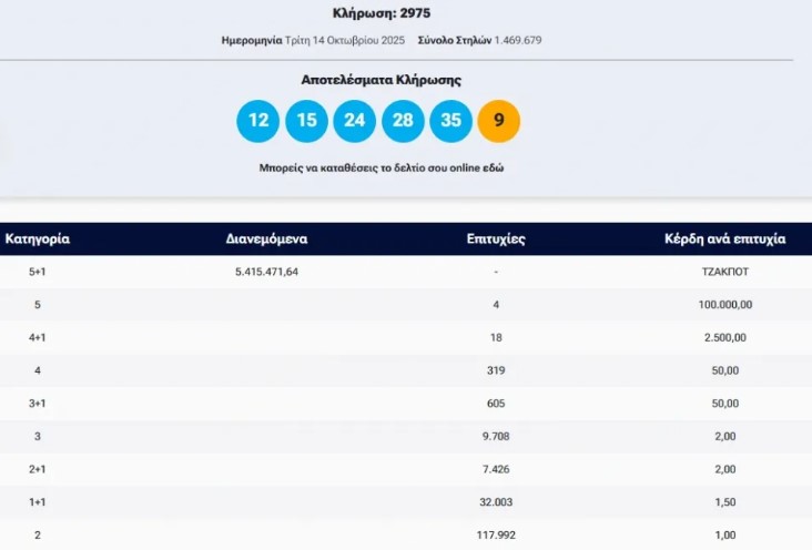 Πραγματοποιήθηκε το βράδυ της Τρίτης 14 Οκτωβρίου η υπ’ αριθμόν 2975 κλήρωση Τζόκερ του ΟΠΑΠ, που μοιράζει στους τυχερούς της πρώτης κατηγορίας 5.415.471,64 ευρώ.