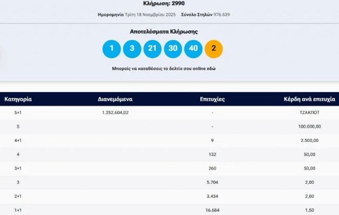 Πραγματοποιήθηκε το βράδυ της Τρίτης (18/11) η κλήρωση 2990 του Τζόκερ που μοιράζει στην πρώτη κατηγορία πάνω από 1,2 εκατομμύριο ευρώ.