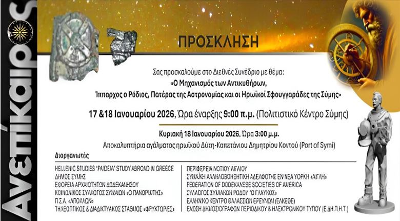 Διεθνές συνέδριο «Ο Μηχανισμός των Αντικυθήρων, Ίππαρχος ο Ρόδιος και οι Συμιακοί Ήρωες του Βυθού». Σύμη Σάββατο 17 και την Κυριακή 18 Ιανουαρίου 2026, προς τιμήν των δυτών των Αντικυθήρων