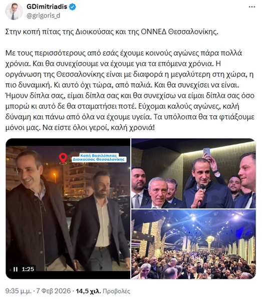 Τέλος, ο πρόεδρος της ΔΕΕΠ Α’ Θεσσαλονίκης, Νίκος Πατσέας, τόνισε την καθοριστική συμβολή του Γρηγόρη Δημητριάδη στις εκλογικές επιτυχίες της Νέας Δημοκρατίας, επισημαίνοντας παράλληλα τον ρόλο του στη διαμόρφωση της εικόνας της ως ανοιχτού και σύγχρονου κόμματος.