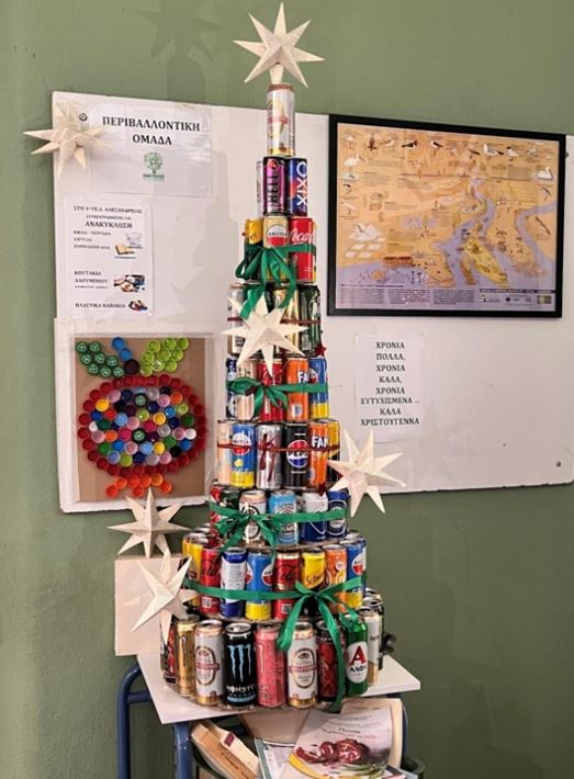 Στις φωτογραφίες το χριστουγεννιάτικο δέντρο του σχολείο μας, μπροστά στον πίνακα της περιβαλλοντικής ομάδας με όλα τα υλικά που συγκεντρώνουμε για ανακύκλωση.