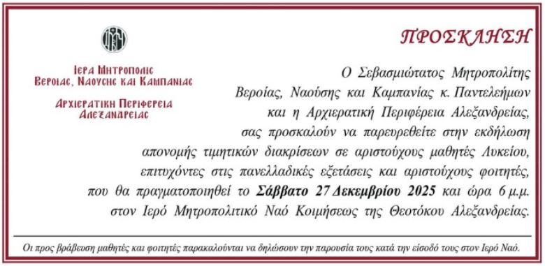 σας προσκαλούν να παρευρεθείτε στην εκδήλωση απονομής τιμητικών διακρίσεων σε αριστούχους μαθητές Λυκείου, επιτυχόντες στις πανελλαδικές εξετάσεις και αριστούχους φοιτητές, που θα πραγματοποιηθεί το Σάββατο 27 Δεκεμβρίου 2025 και ώρα 6 μ.μ. στον Ιερό Μητροπολιτικό Ναό Κοιμήσεως της Θεοτόκου Αλεξανδρείας.