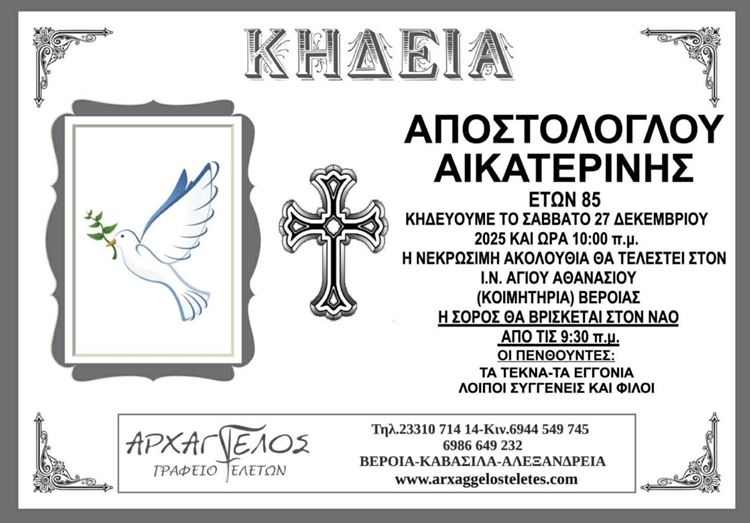 Η κηδεία της Αποστόλογλου Αικατερίνης το σάββατο 27 Δεκεμβρίου 2025