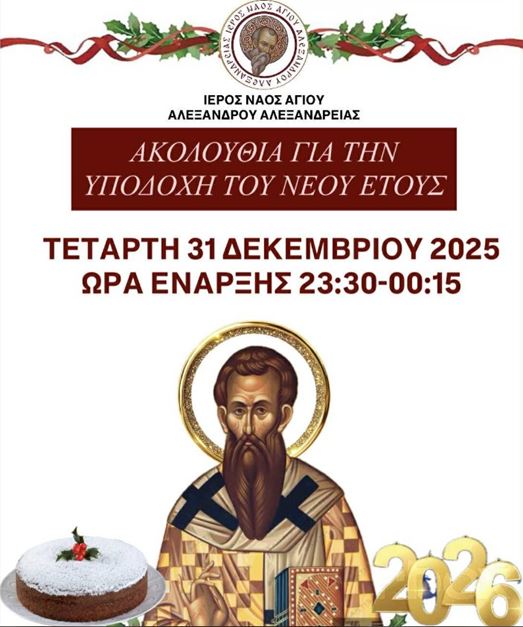 Με κατάνυξη και πνευματική προετοιμασία ο Ιερός Ναός Αγίου Αλεξάνδρου Αλεξάνδρειας ανακοινώνει την τέλεση της καθιερωμένης ιερής ακολουθίας για την υποδοχή του νέου έτους, την Τετάρτη 31 Δεκεμβρίου 2025.
