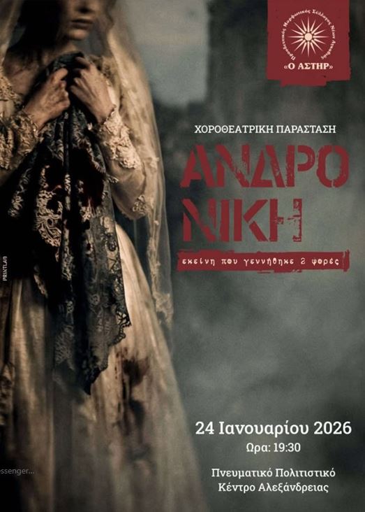 Σας προσκαλούμε στη χοροθεατρική παράσταση το Σάββατο 24 Ιανουαρίου 2026 στο Πνευματικό Πολιτιστικό Κέντρο Αλεξάνδρειας στις 7:30 μ.μ. για φιλανθρωπικό σκοπό