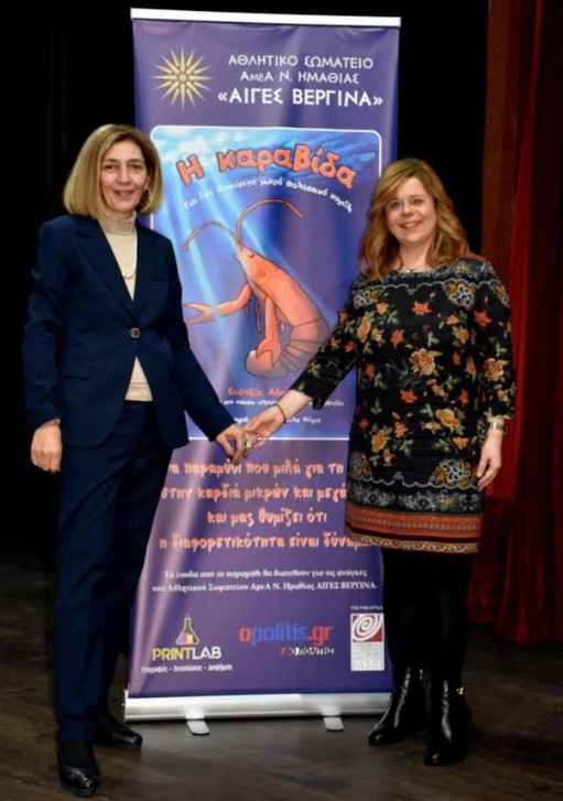 Το Διοικητικό Συμβούλιο του Αθλητικού Σωματείου ΑμεΑ Ν. Ημαθίας «ΑΙΓΕΣ ΒΕΡΓΙΝΑ» και η ψυχολόγος – επιστημονική συνεργάτιδα του Σωματείου, κα Ευδοξία Αδαμίδου, πραγματοποίησαν με ιδιαίτερη επιτυχία την παρουσίαση του παραμυθιού «Η Καραβίδα – Για ένα δυσεύρετο μικρό θαλασσινό κοχύλι», το Σάββατο 24 Ιανουαρίου 2026, στις 17:30, στο Θέατρο της Στέγης Γραμμάτων και Τεχνών Βέροιας, στην αίθουσα «Οδυσσέας Γωνιάδης» με την στήριξη της ΚΕΠΑ Δ. Βέροιας.