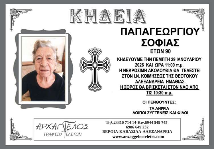 Η κηδεία της Παπαγεωργίου Σοφίας στην Αλεξάνδρεια την Πέμπτη 29 Ιανουαρίου 2029.