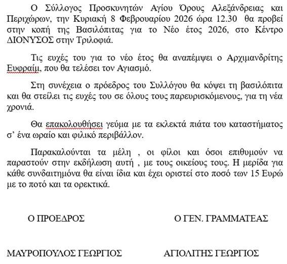 Ο Σύλλογος Προσκυνητών Αγίου Όρους Αλεξάνδρειας και Περιχώρων, κόβει την πρωτοχρονιάτικη βασιλόπιτα
