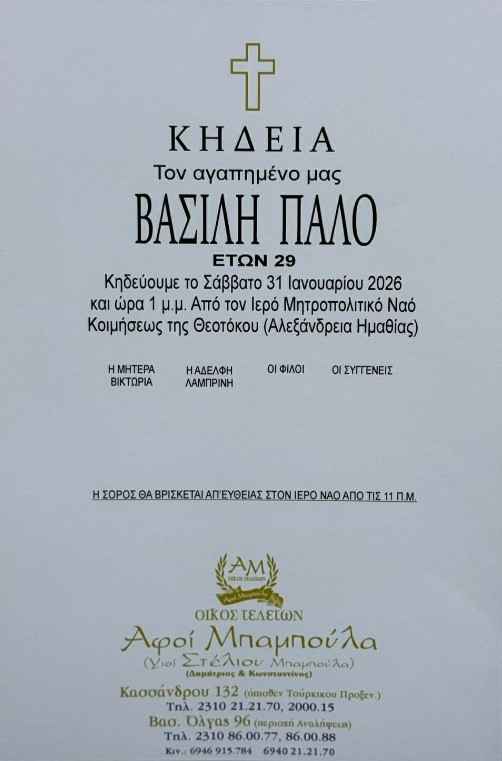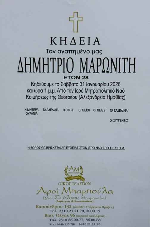 Οι κηδείες των Πάλο Βασίλη, Μαρωνίτη Δημήτριου και Μαρκόπουλου Κωνσταντίνου στην Αλεξάνδρεια το Σάββατο 31 Ιανουαρίου 2026