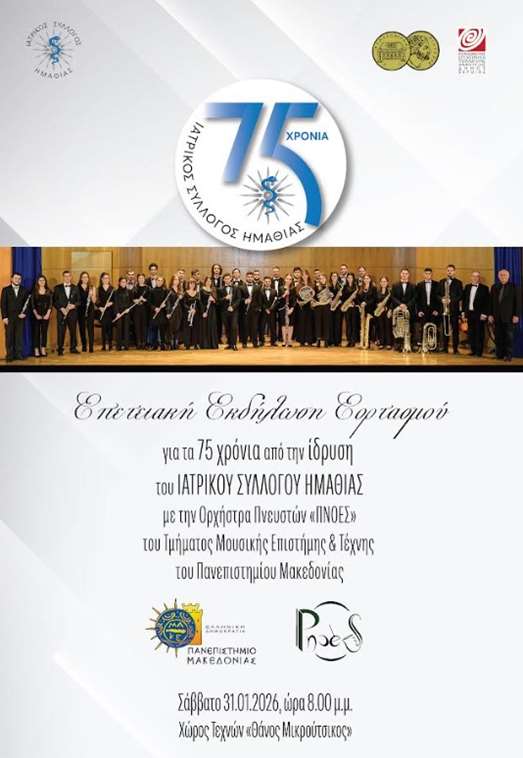 Στα 75 χρόνια από την ίδρυση του Ιατρικού Συλλόγου Ημαθίας (1951-2926) είναι αφιερωμένη η εκδήλωση που διοργανώνει ο ΙΣΗ με τη στήριξη του Δήμου Βέροιας και της ΚΕΠΑ Δ. Βέροιας, το Σάββατο 31 Ιανουαρίου 2026, στις 8.00μμ, στον Χώρο Τεχνών –Θάνος Μικρούτσικος.