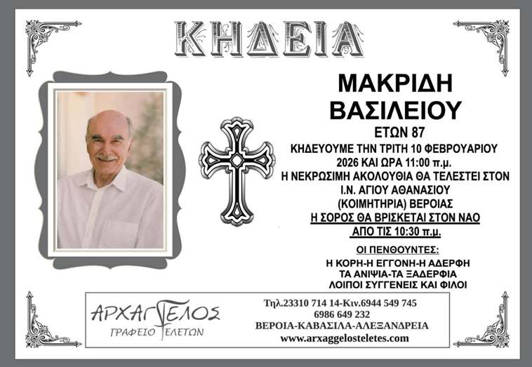 Η κηδεία του Μακρίδη Βασιλείου την Τρίτη 10 Φεβρουαρίου 2026.