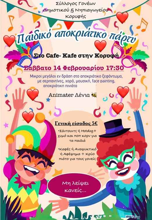 Παιδικό αποκριάτικο πάρτυ του Συλλόγου Γονέων Δημοτικού και Νηπιαγωγείου Κορυφής.