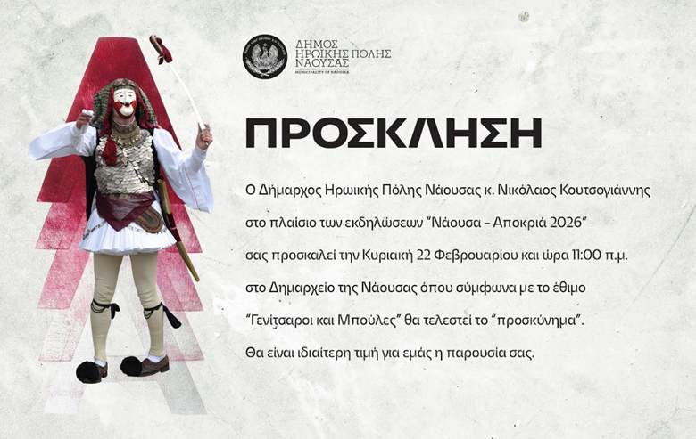 O Δήμος Ηρωικής Πόλης Νάουσας στο πλαίσιο των εκδηλώσεων "Νάουσα-Αποκριά 2026" διοργανώνει την Κυριακή 22 Φεβρουαρίου και ώρα 14:00 στην Πλατεία Καρατάσου, μουσική συναυλία με το μουσικό σχήμα "MaCho Βand" με ελεύθερη είσοδο για το κοινό.