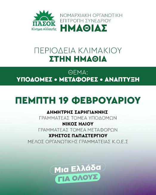 Περιοδεία κλιμακίου του ΠΑΣΟΚ – Κινήματος Αλλαγής στην Ημαθία, σε «Υποδομές – Μεταφορές – Ανάπτυξη», και θα πραγματοποιηθεί την Πέμπτη 19 Φεβρουαρίου.