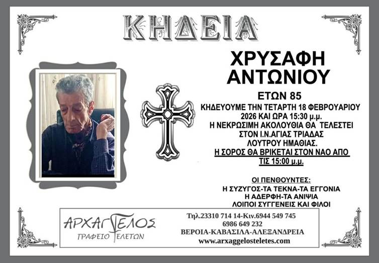 Η κηδεία του Χρυσάφη Αντωνίου στο Λουτρό Ημαθίας την Τετάρτη 18 Φεβρουαρίου 2026