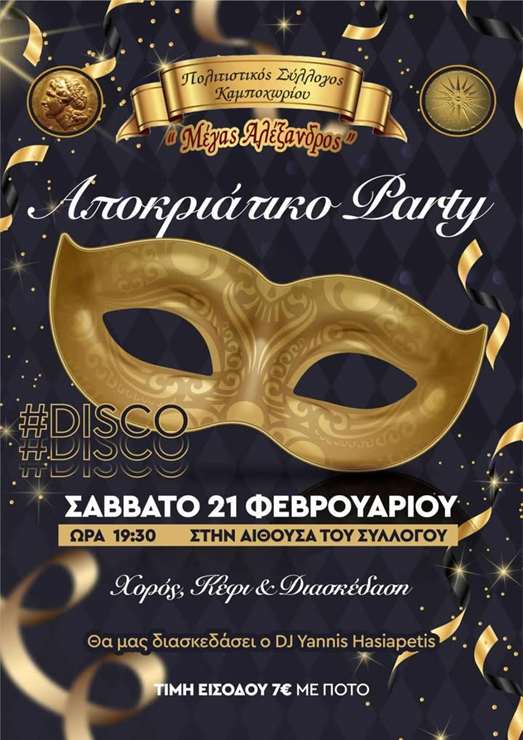 Ο Πολιτιστικός Σύλλογος Καμποχωρίου ''Μέγας Αλέξανδρος'' σας προσκαλεί σε ένα ανεπανάληπτο αποκριάτικο πάρτυ.