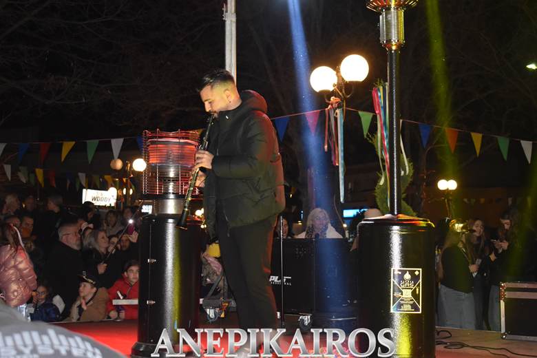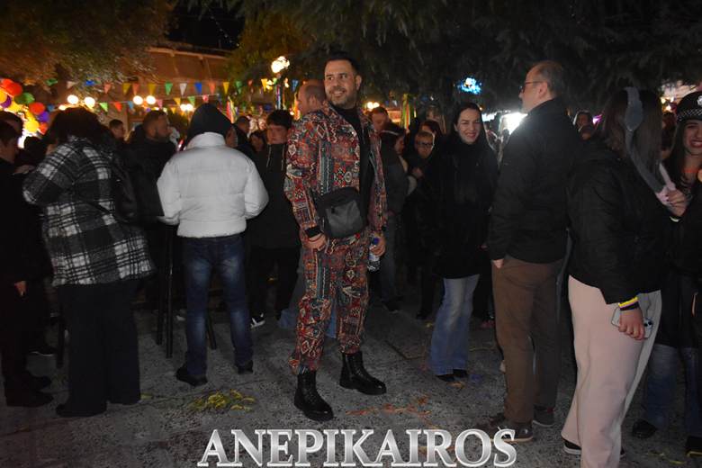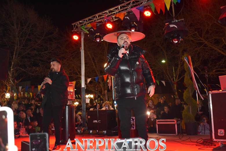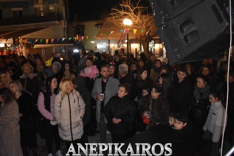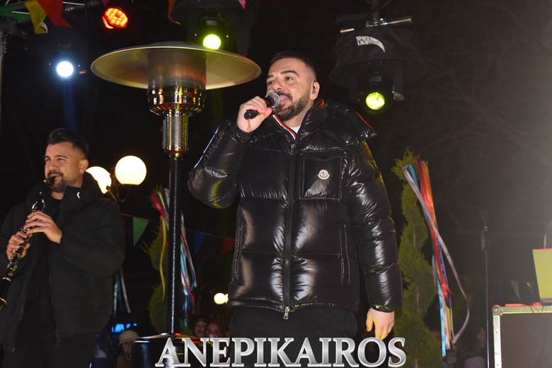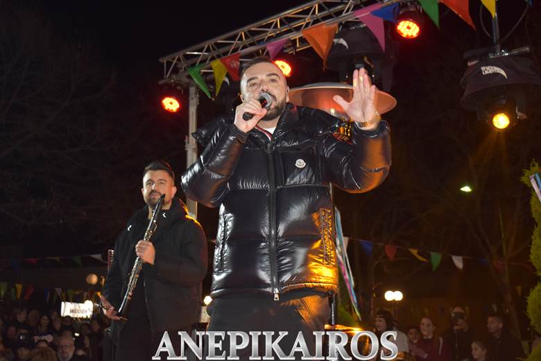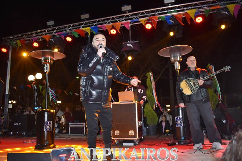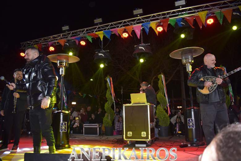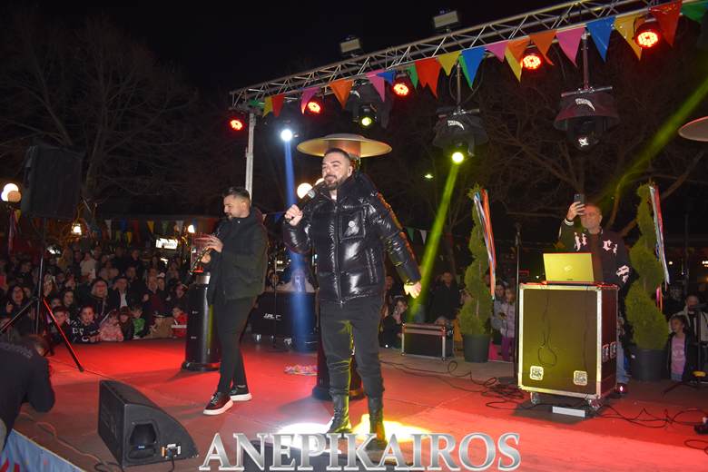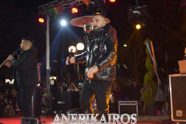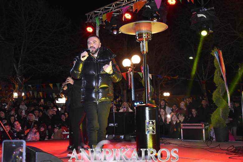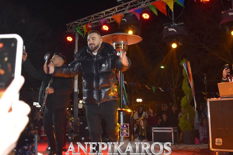 Η γιορτή ξεκίνησε λίγο πριν την εμφάνιση του γνωστού τραγουδιστή, όταν μπροστά στο Δημαρχείο στήθηκε μια μικρή αλλά εντυπωσιακή αποκριάτικη παρέλαση, με καρναβαλιστές, μουσική και κεράσματα που έδωσαν τον τόνο της βραδιάς.