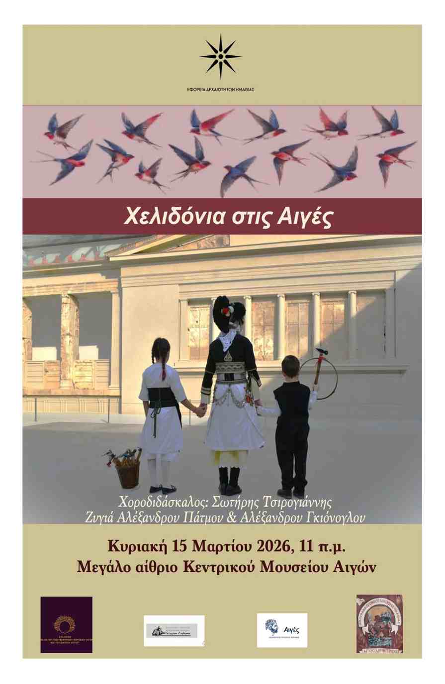 Την Κυριακή 15 Μαρτίου και ώρα 11:00π.μ στο Κεντρικό Μουσείο Αιγών (ΒΕΡΓΙΝΑ ΗΜΑΘΙΑΣ) θα αναβιώσει το πανάρχαιο έθιμο της Χελιδόνας, ένα ανοιξιάτικο λαϊκό δρώμενο με ρίζες στην αρχαιότητα, που συνδέεται με το καλωσόρισμα της άνοιξης και την ευχή για έναν καλό και γόνιμο χρόνο μαζί με τον Πολιτιστικό Σύλλογο Βεργίνας ¨ΑΙΓΕΣ¨ και τον Πολιτιστικό Σύλλογο Ξεχασμένης ΄΄ΓΕΩΡΓΙΟΣ ΣΕΦΕΡΗΣ΄΄