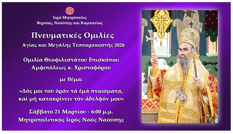 Με την πατρική μέριμνα του Ποιμενάρχου μας, Σεβασμιωτάτου Μητροπολίτου Βεροίας, Ναούσης και Καμπανίας κ. Παντελεήμονος πραγματοποιούνται για ακόμη μία χρονιά οι πνευματικές ομιλίες κατά τα Σαββατοκύριακα της Αγίας και Μεγάλης Τεσσαρακοστής.
