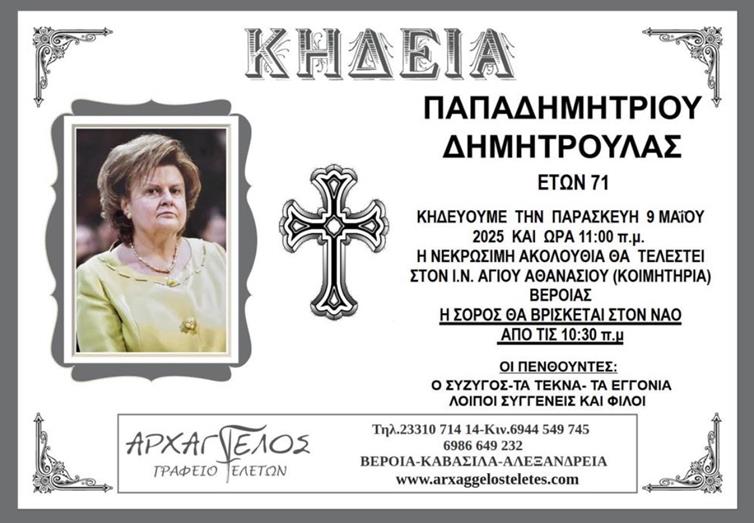 Η κηδεία της Παπαδημητρίου Δημητρούλας την Παρασκευή 9 Μαΐου 2025