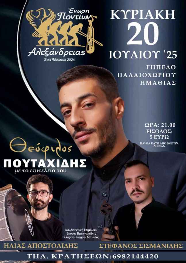 Η Ένωση Ποντίων Αλεξάνδρειας διοργανώνει την καλοκαιρινή της εκδήλωση την Κυριακή 20 Ιουλίου 2025, στο γήπεδο του Παλαιοχωρίου Ημαθίας.