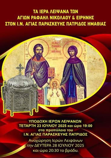 Τα λείψανα των αγίων Ραφαήλ, Νικολάου και Ειρήνης υποδέχεται η Πατρίδα Βέροιας Τα ιερά λείψανα των νεοφανών αγίων Ραφαήλ, Νικολάου και Ειρήνης στον πανηγυρίζοντα ιερό ναό Αγίας Παρασκευής στην Πατρίδα Ημαθίας.