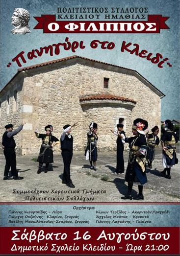 Ο πολιτιστικός σύλλογος Κλειδίου "ο Φίλιππος" σας προσκαλεί στην μουσικοχορευτική παράσταση που διοργανώνει το Σάββατο 16 Αυγούστου 2025 και ώρα 21:30 στον προαύλιο χώρο του δημοτικού σχολείου Κλειδίου.