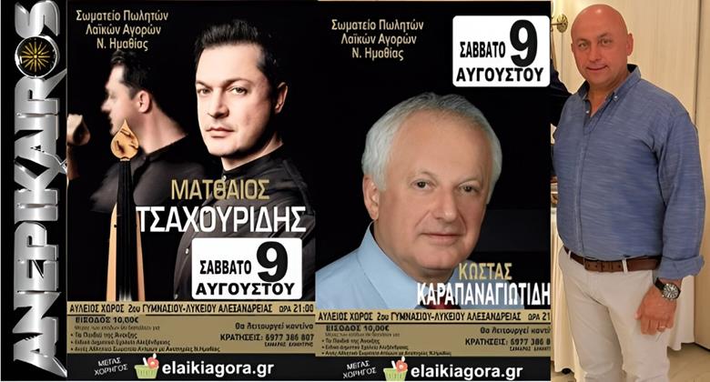 Σημειώστε την ημερομηνία! Στις 9 Αυγούστου, ο προαύλιος χώρος του 2ου Γυμνασίου Αλεξάνδρειας θα μετατραπεί σε μια μεγάλη μουσική σκηνή, φιλοξενώντας μια ξεχωριστή συναυλία με τους Ματθαίο Τσαχουρίδη και Κώστα Καραπαναγιωτίδη και την συμμετοχή της ορχήστρας του Δημήτρη Παράσχου.