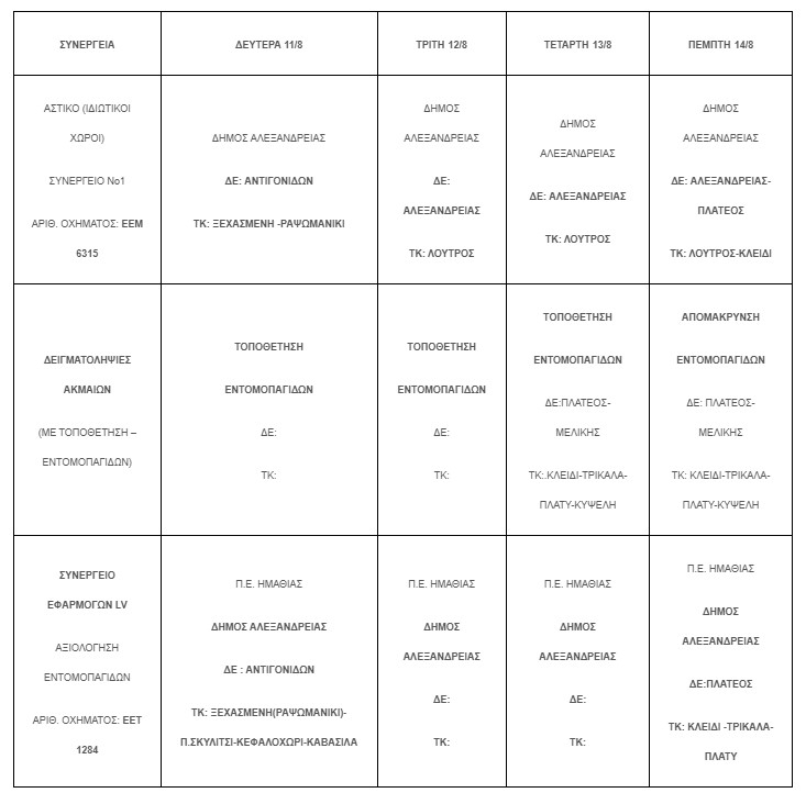 Ανακοινώνεται από τον Δήμο Αλεξάνδρειας το πρόγραμμα Αστικής Επίγειας Καταπολέμησης Κουνουπιών για την εβδομάδα από Δευτέρα 11 Αυγούστου, έως και την Πέμπτη, 14 Αυγούστου 2025.