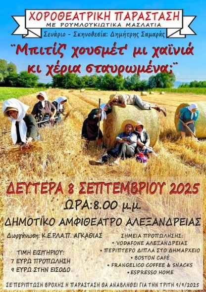ΔΕΥΤΕΡΑ 8 ΣΕΠΤΕΜΒΡΙΟΥ 2025 ΩΡΑ:8.00 μ.μ. ΔΗΜΟΤΙΚΟ ΑΜΦΙΘΕΑΤΡΟ ΑΛΕΞΑΝΔΡΕΙΑΣ