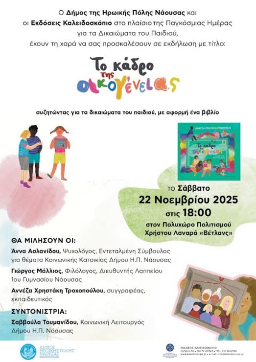 Ο Δήμος της Ηρωικής Πόλεως Νάουσας και οι Εκδόσεις Καλειδοσκόπιο, στο πλαίσιο της Παγκόσμιας Ημέρας για τα Δικαιώματα του Παιδιού, έχουν τη χαρά να προσκαλέσουν το κοινό σε εκδήλωση με τίτλο «Το Κάδρο της Οικογένειας – Συζητώντας για τα δικαιώματα του παιδιού, με αφορμή ένα βιβλίο».