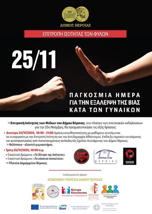 Η Επιτροπή Ισότητας των Φύλων του Δήμου Βέροιας, στο πλαίσιο των επετειακών εκδηλώσεων για την 25η Νοέμβρη, θα πραγματοποιήσει τις εξής δράσεις:
