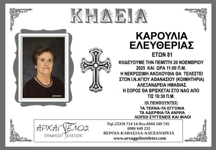 Η κηδεία της Καρούλια Ελευθερίας στην Αλεξάνδρεια την Πέμπτη 20 Νοεμβρίου 2025.