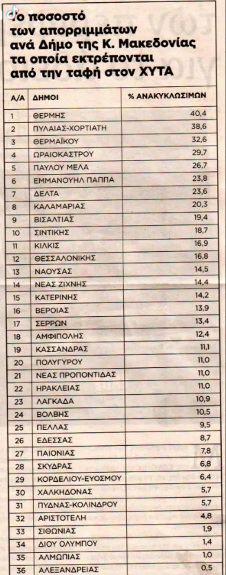 Στην τελευταία θέση ανάμεσα σε 36 δήμους της Περιφέρειας Κεντρικής Μακεδονίας κατατάσσεται ο Δήμος Αλεξάνδρειας όσον αφορά το ποσοστό των απορριμμάτων που εκτρέπονται από την ταφή στον ΧΥΤΑ και οδηγούνται προς ανακύκλωση σύμφωνα με δημοσίευμα της εφημερίδας Μακεδονία.